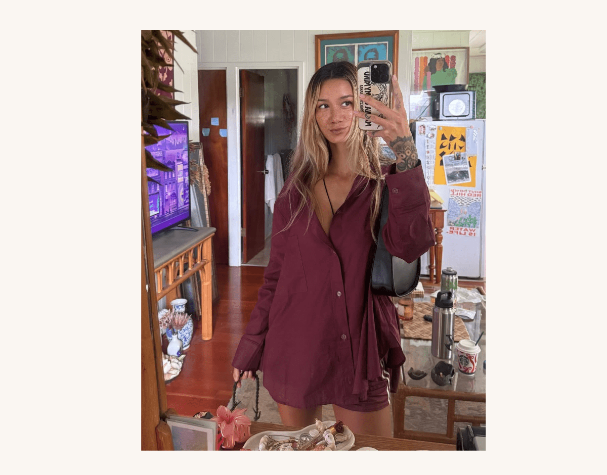 @gypsyone wears Maroon Boyfriend Button Down Shirt x Sporty Low Rise Drawstring Short | | @gypsyone wears Maroon Boyfriend Button Down Shirt x Sporty Low Rise Drawstring Short |